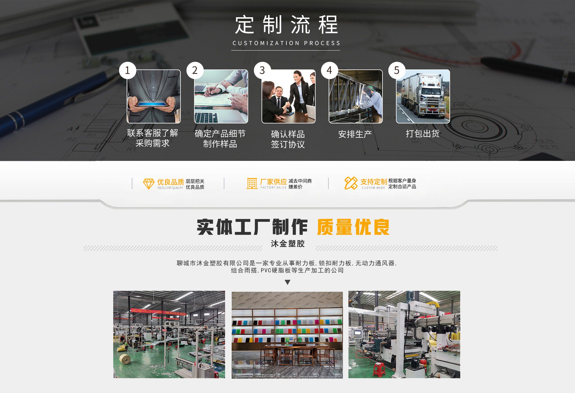 聊城市沐金塑膠有限公司注冊資金2180萬元,占地20000余平方,擁有自建廠房15000平方,員工100余名。10余年來,公司主營耐力板,鎖扣耐力板,耐力板深加工,無動(dòng)力通風(fēng)器,組合雨搭,PVC硬脂板,耐力板廠家等板材的發(fā)展戰(zhàn)略,逐漸成長為綜合性企業(yè)。 公司擁有多條板材共擠生產(chǎn)線,采用世界知名品牌進(jìn)口原材料和先進(jìn)工藝,依據(jù)完善的ISO9001質(zhì)量管理體系和ISO14001環(huán)境管理體系,為產(chǎn)品的卓越品質(zhì)提供了強(qiáng)有力的保證。憑借過硬的創(chuàng)新能力和堅(jiān)實(shí)的硬件基礎(chǔ),贏創(chuàng)已成為國內(nèi)領(lǐng)先的熱塑性板材生產(chǎn)商,產(chǎn)品被廣泛應(yīng)用于建筑業(yè)、農(nóng)業(yè)、工業(yè)、廣告業(yè)、安防行業(yè)及DIY領(lǐng)域。 公司始終致力于通過提供最優(yōu)的板材應(yīng)用解決方案,為客戶創(chuàng)造最高的價(jià)值;堅(jiān)守創(chuàng)新、質(zhì)量、靈活、服務(wù)和速度的核心價(jià)值觀;堅(jiān)持“完美的產(chǎn)品需要完美服務(wù)的支持”的經(jīng)營理念,努力實(shí)現(xiàn)成為世界領(lǐng)先的板材與解決方案供應(yīng)商的夢想?! ≡谖磥恚緦⒘⒆憧蛻粜枨?,不斷改變和完善現(xiàn)有產(chǎn)品,拓展產(chǎn)品線和充分開發(fā)板材的應(yīng)用領(lǐng)域,為客戶創(chuàng)造全方位的價(jià)值。同時(shí)更好地實(shí)現(xiàn)員工的價(jià)值,實(shí)現(xiàn)公司團(tuán)隊(duì)的價(jià)值。我們將與您一起創(chuàng)贏未來! 企業(yè)使命:成為世界領(lǐng)先的板材與解決方案供應(yīng)商?! 」驹妇埃和ㄟ^提供最優(yōu)的板材應(yīng)用解決方案,為客戶創(chuàng)造最高的價(jià)值。 核心價(jià)值觀:質(zhì)量...